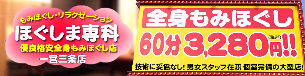 『ほぐしま専科 一宮三条店』では、お客様の財布に優しい価格設定で、ご満足いただけるサービスを提供しております。「全身もみほぐし」「足裏もみほぐし」「全身・足裏ハーフ」と3種類のコースから、お客様のニーズに答える為、時間設定を細かく提供しています。